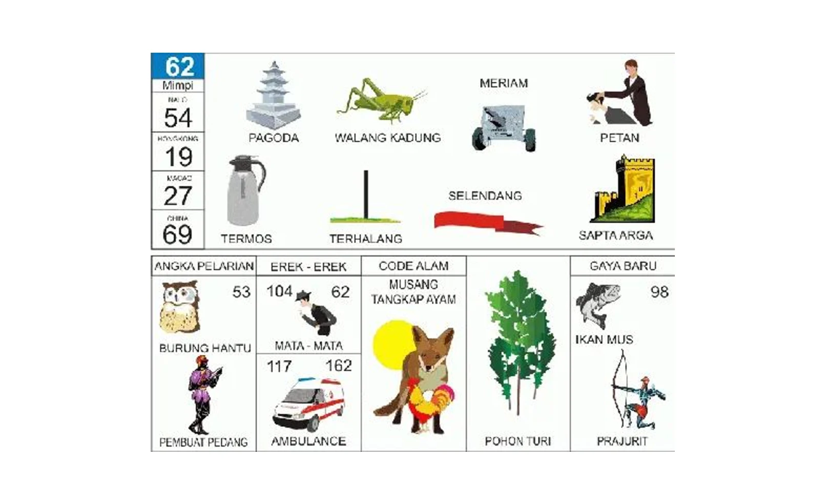 Angka pelarian 53, erek-erek tambahan 104, 117, 162, kode alam musang tangkap ayam, taysen pohon turi, gaya baru 98.