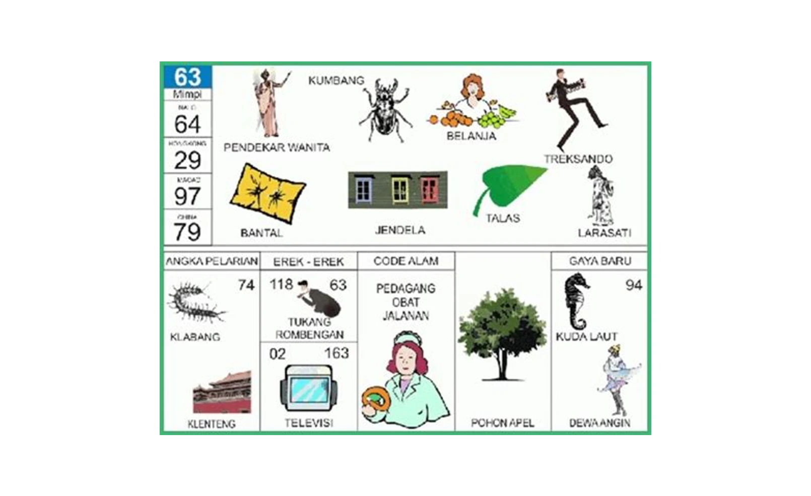 Selain angka utama, erek erek 63 juga memiliki angka pelarian, kode alam, serta gaya baru: