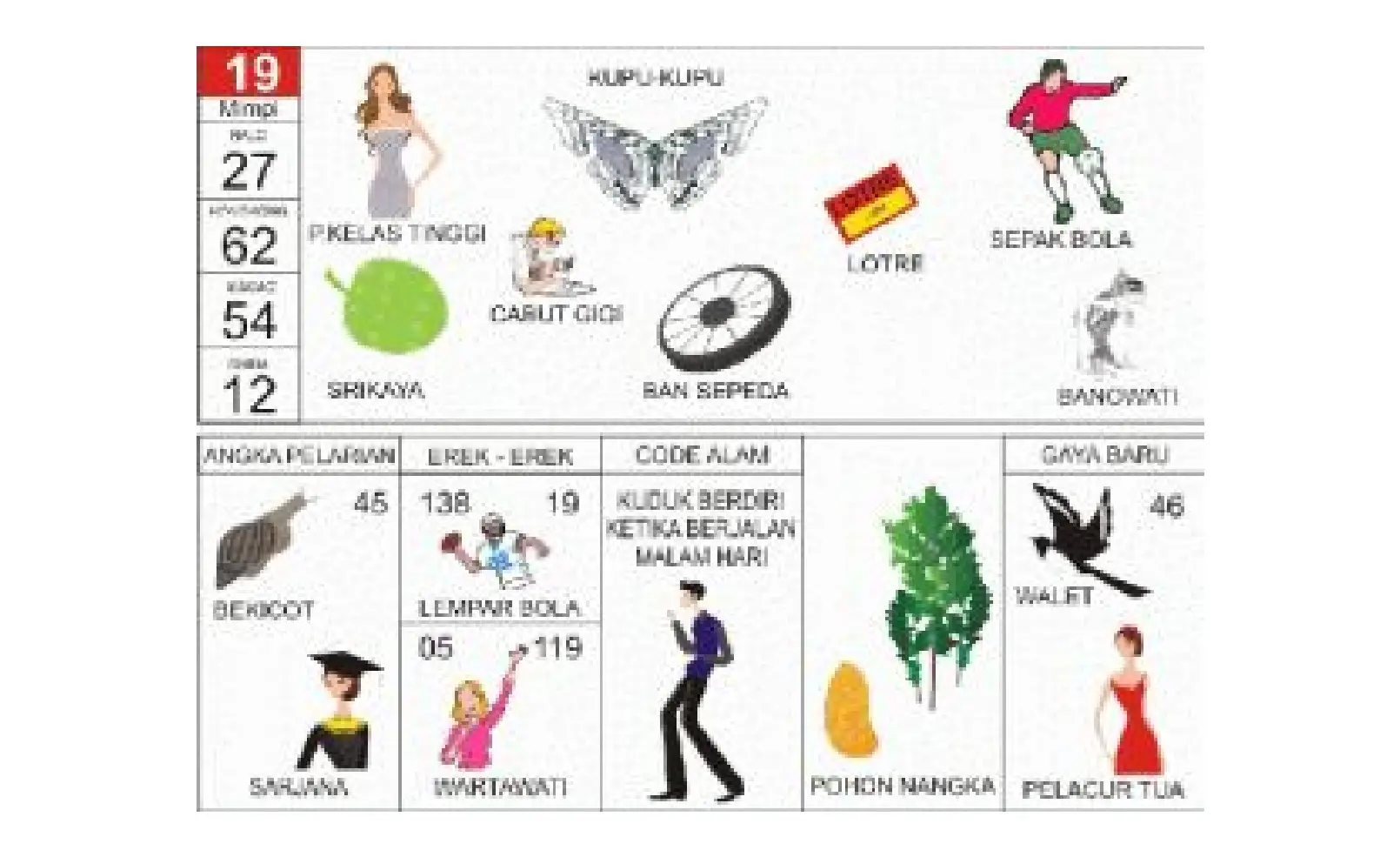 | Bermain bola kaki | Akan mendapat tantangan besar tapi disertai keberuntungan | 27 – 62 |