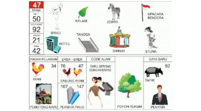 | Simbol tambahan | Tangga, Zebra, Sirkus, Upacara Bendera, Stuna | Masing-masing menggambarkan perjalanan, keseimbangan, hiburan, kehormatan, dan ketenangan |