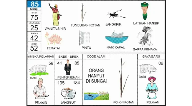 Beberapa simbol umum meliputi pohon rotan, kapal, teratai, dan orang hanyut — masing-masing membawa makna tambahan dalam tafsir mimpi.