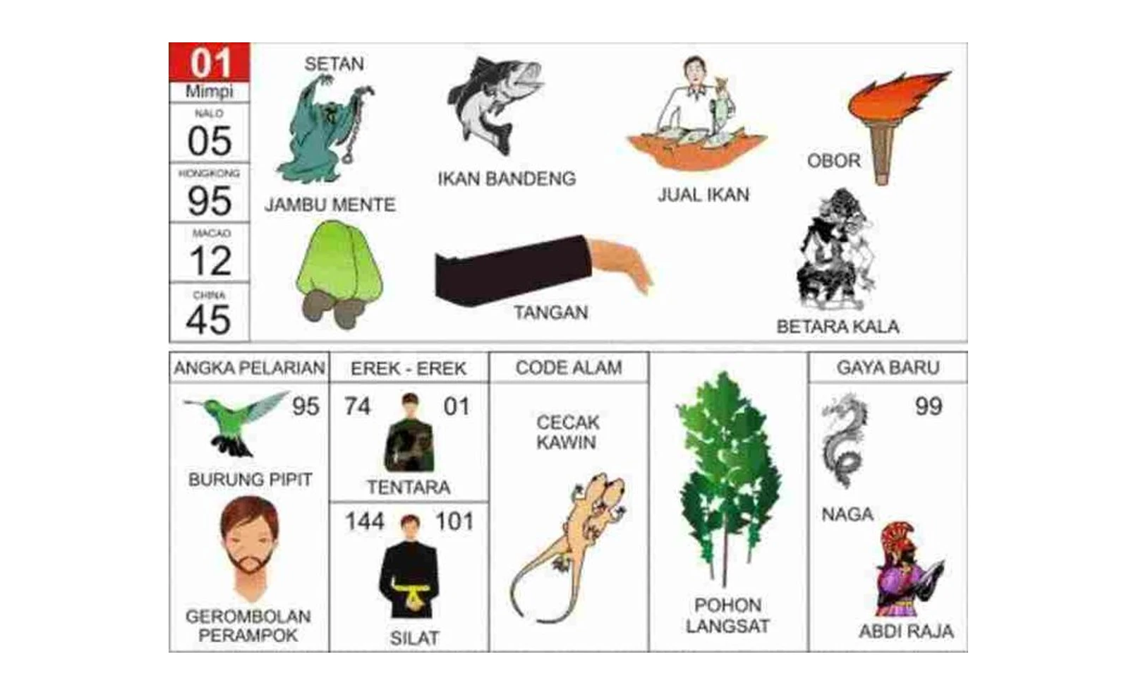 | Kode Alam | Tangan = perubahan baik melalui tanda-tanda sekitar | Cecak kawin, pohon langsat |